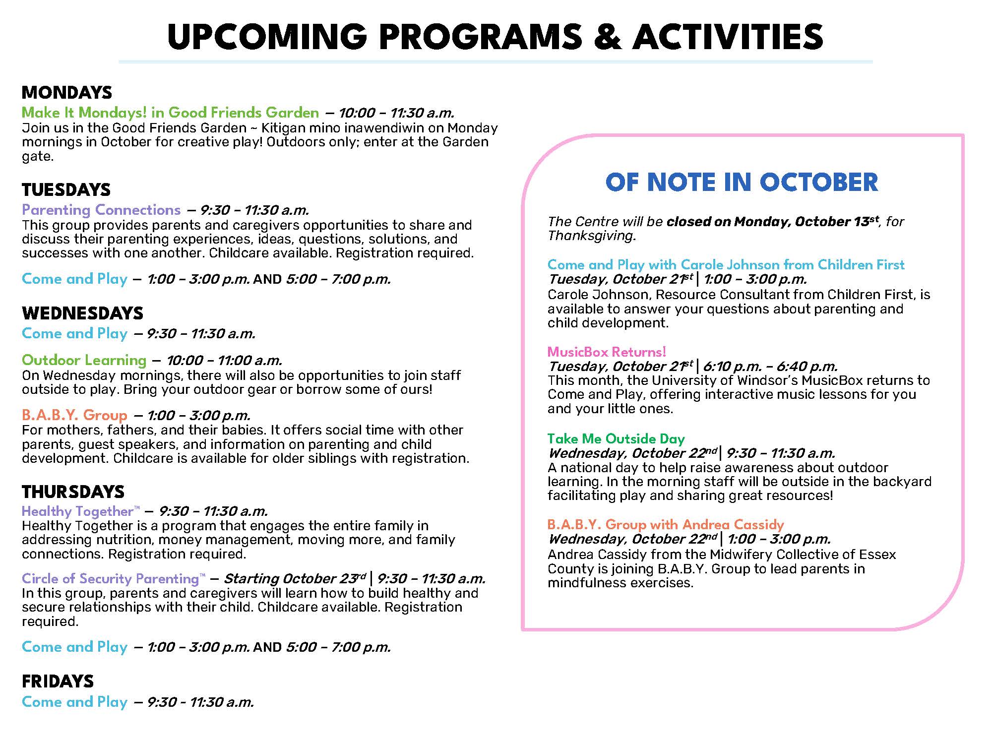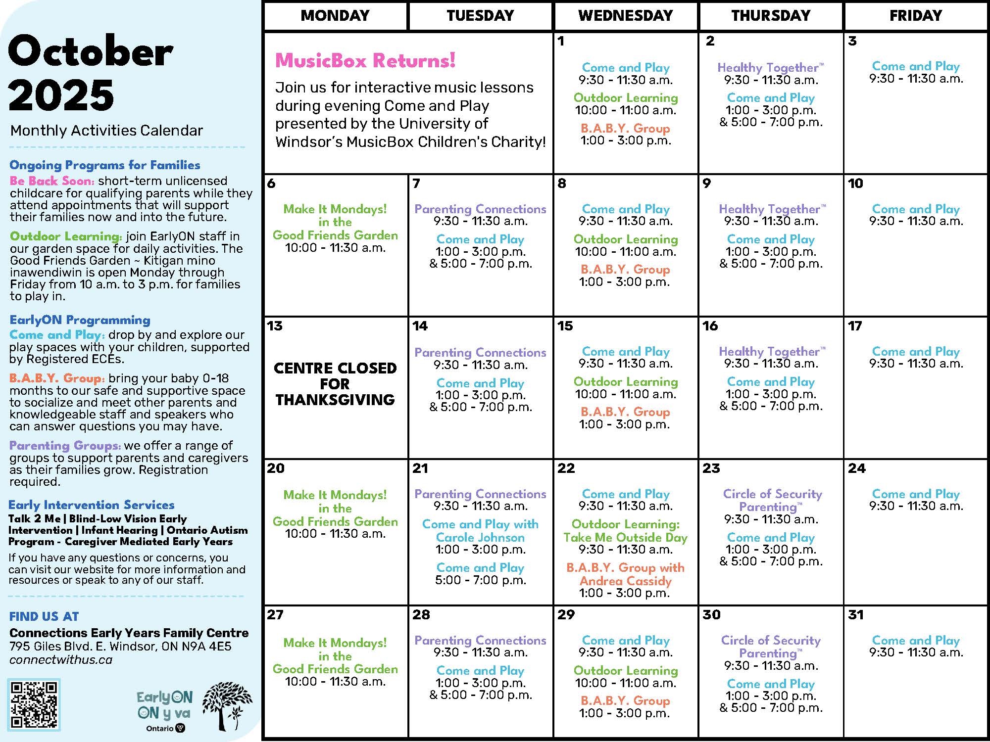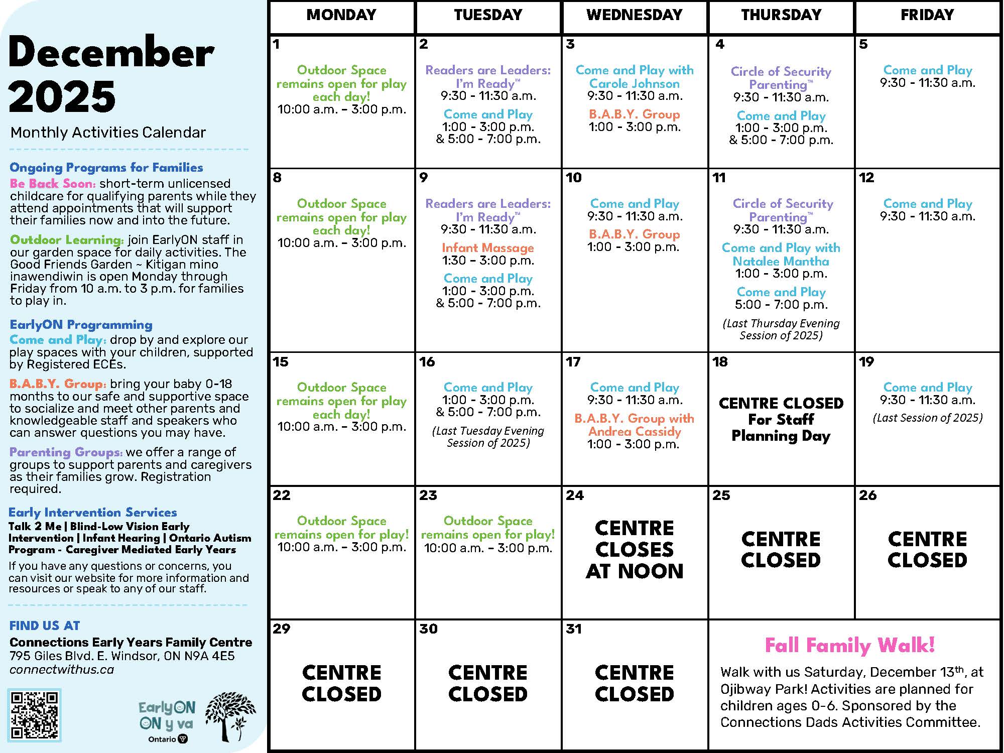 Our staff and community partners offer many EarlyON programs. Check them out below! Please call 519-252-9696 or email EON.connections@connectwithus.ca to register!
