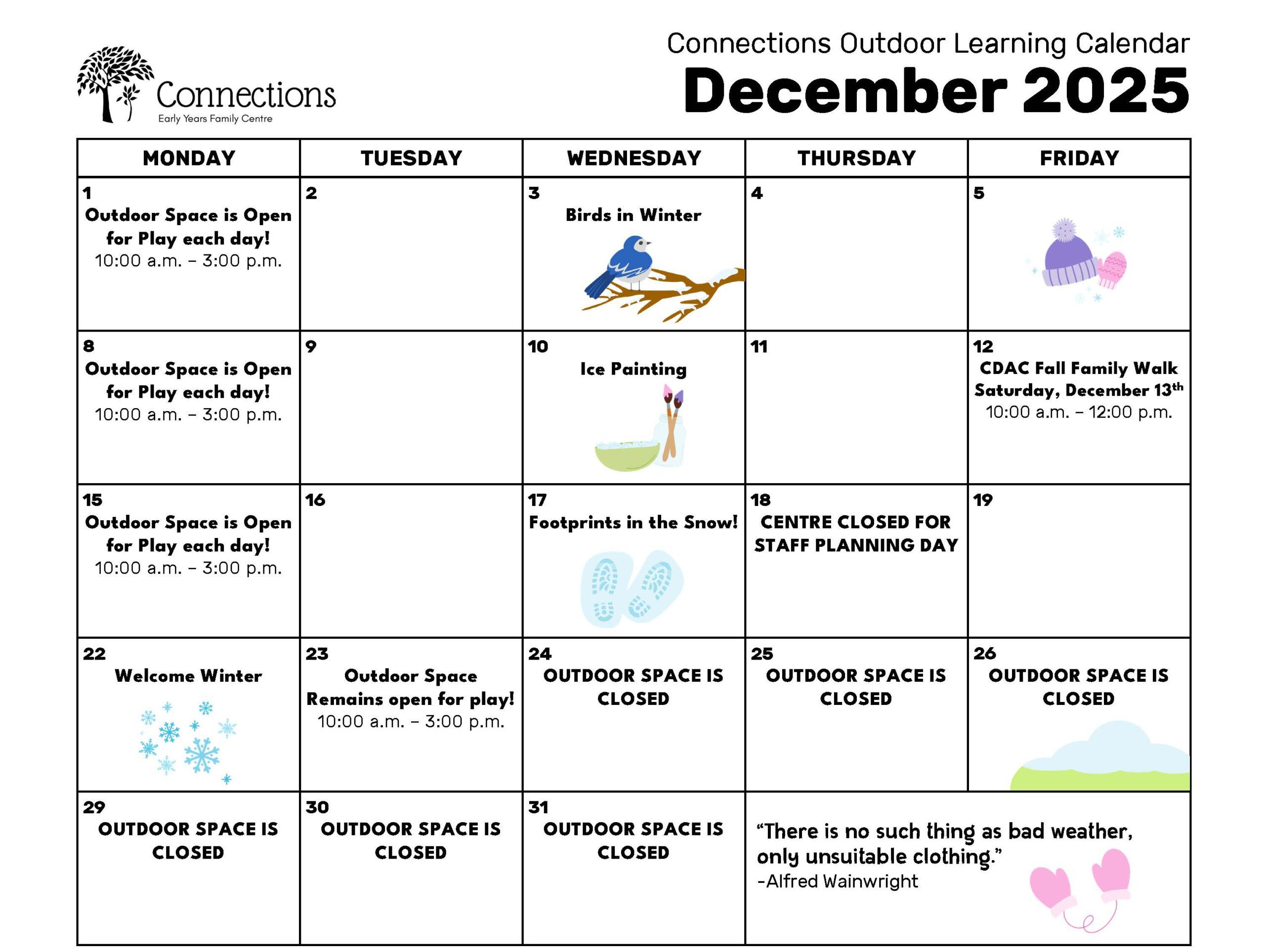Our outdoor play space is open each day from 10:00 – 3:00 p.m. Come see what activities the staff have set out each day!
